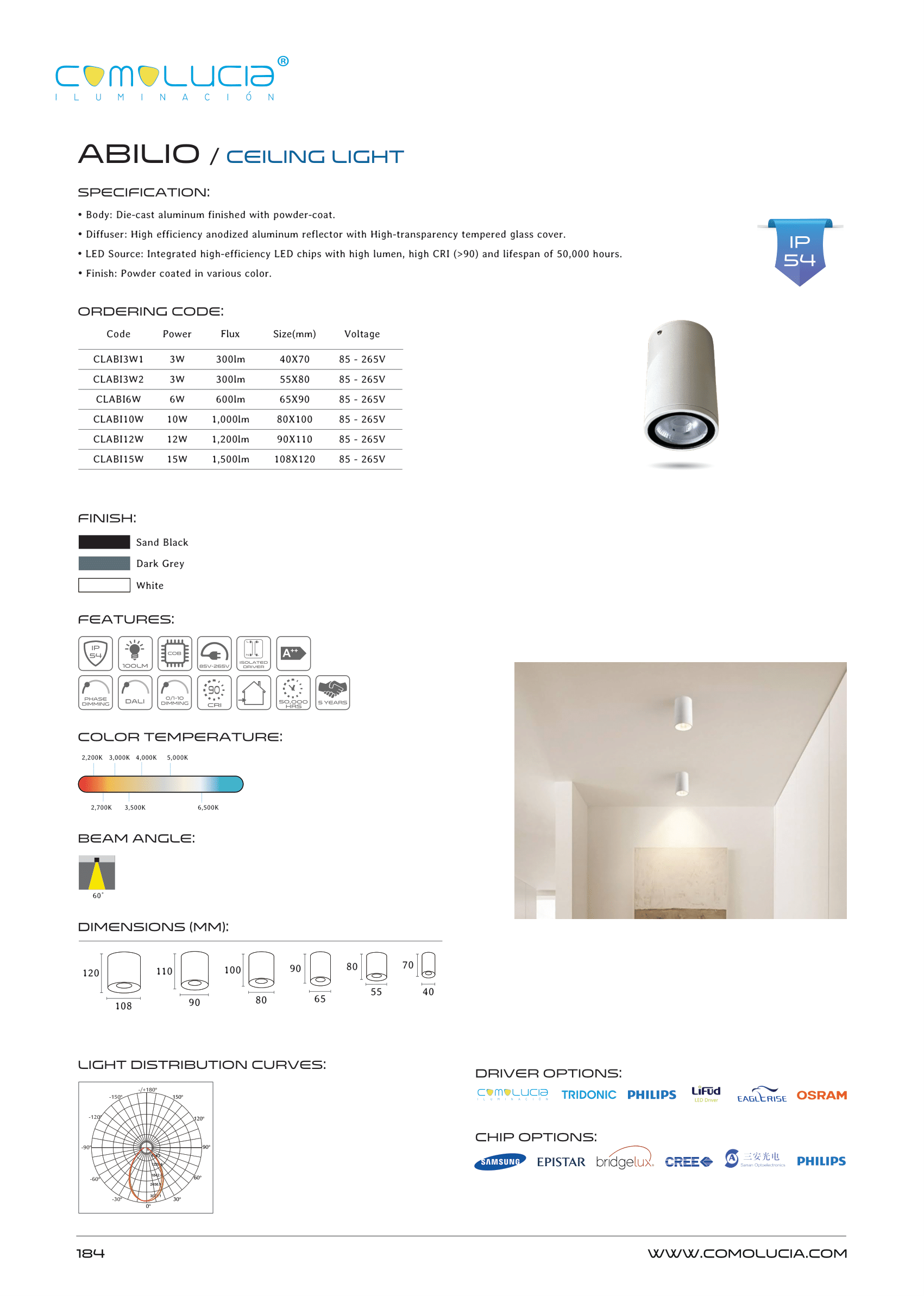 - LED Source: Integrated high-efficiency LED chips with high lumen, high CRI (>90) and lifespan of 50,000 hours. Finish: