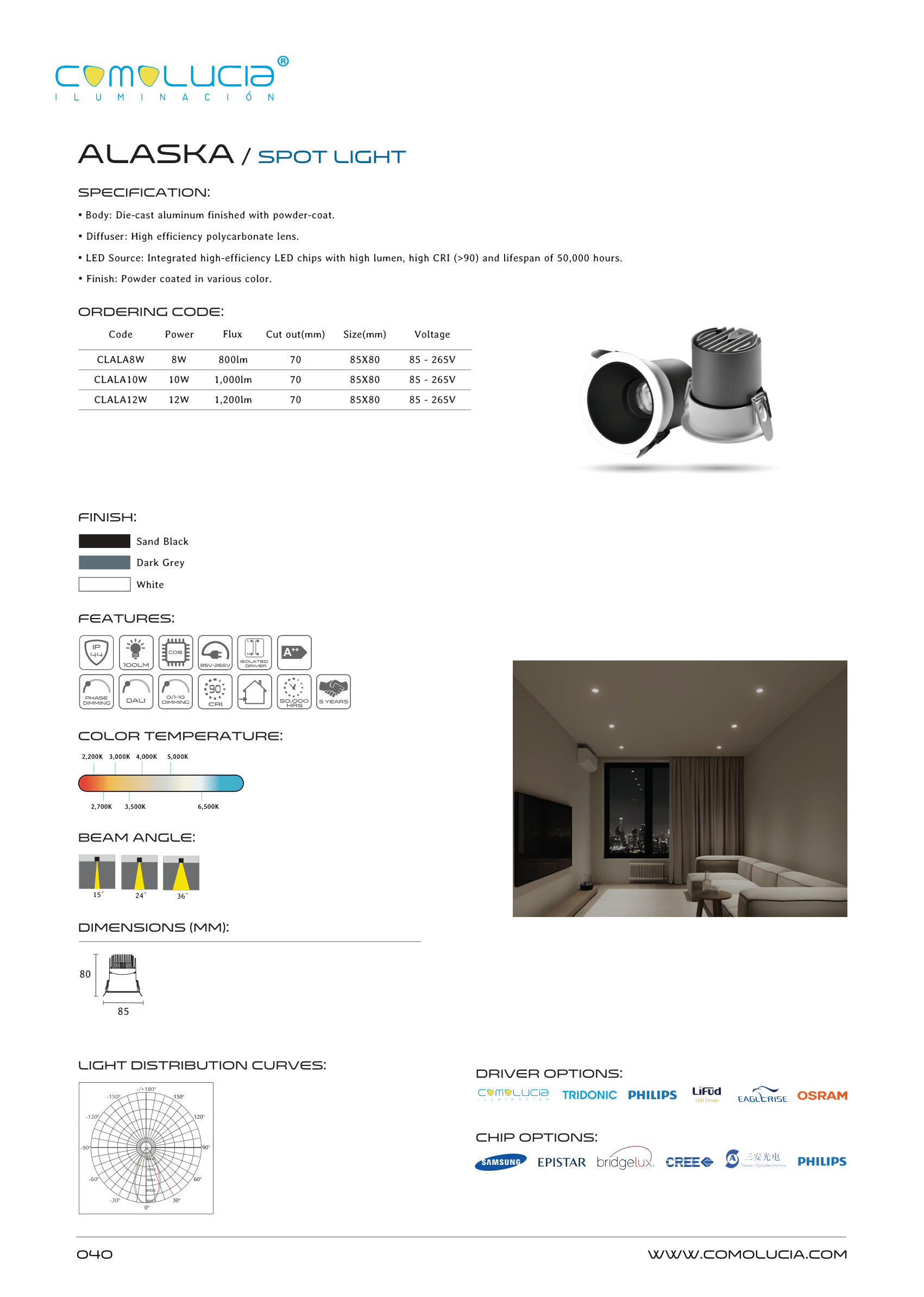 - LED Source: Integrated high-efficiency LED chips with high lumen, high CRI (>90) and lifespan of 50,000 hours. Finish: