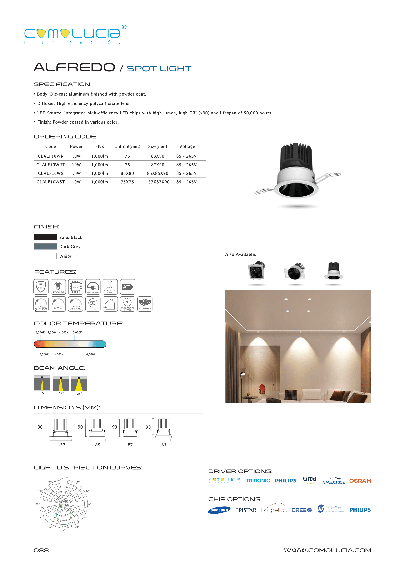 - LED Source: Integrated high-efficiency LED chips with high lumen, high CRI (>90) and lifespan of 50,000 hours.