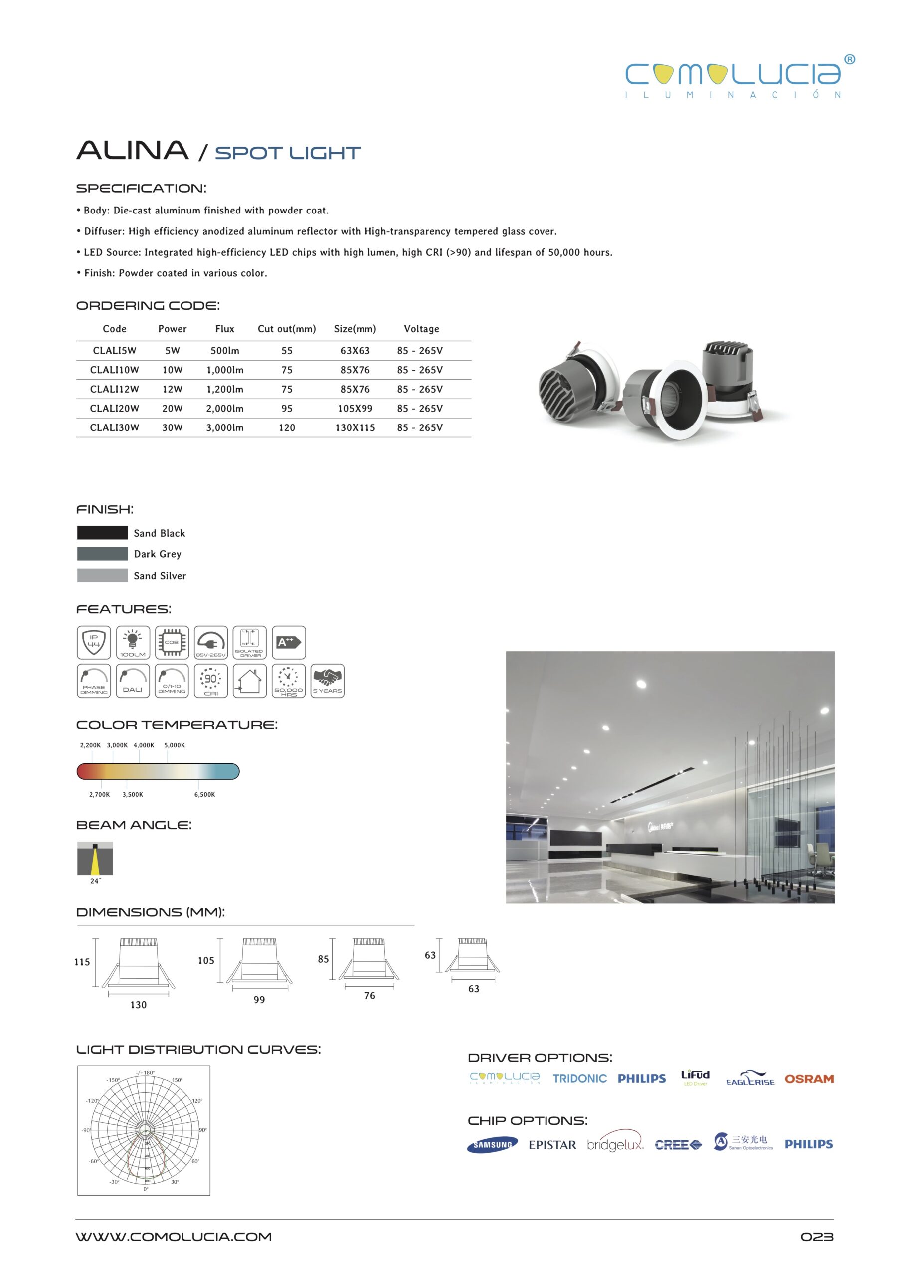 - LED Source: Integrated high-efficiency LED chips with high lumen, high CRI (>90) and lifespan of 50,000 hours. Finish: