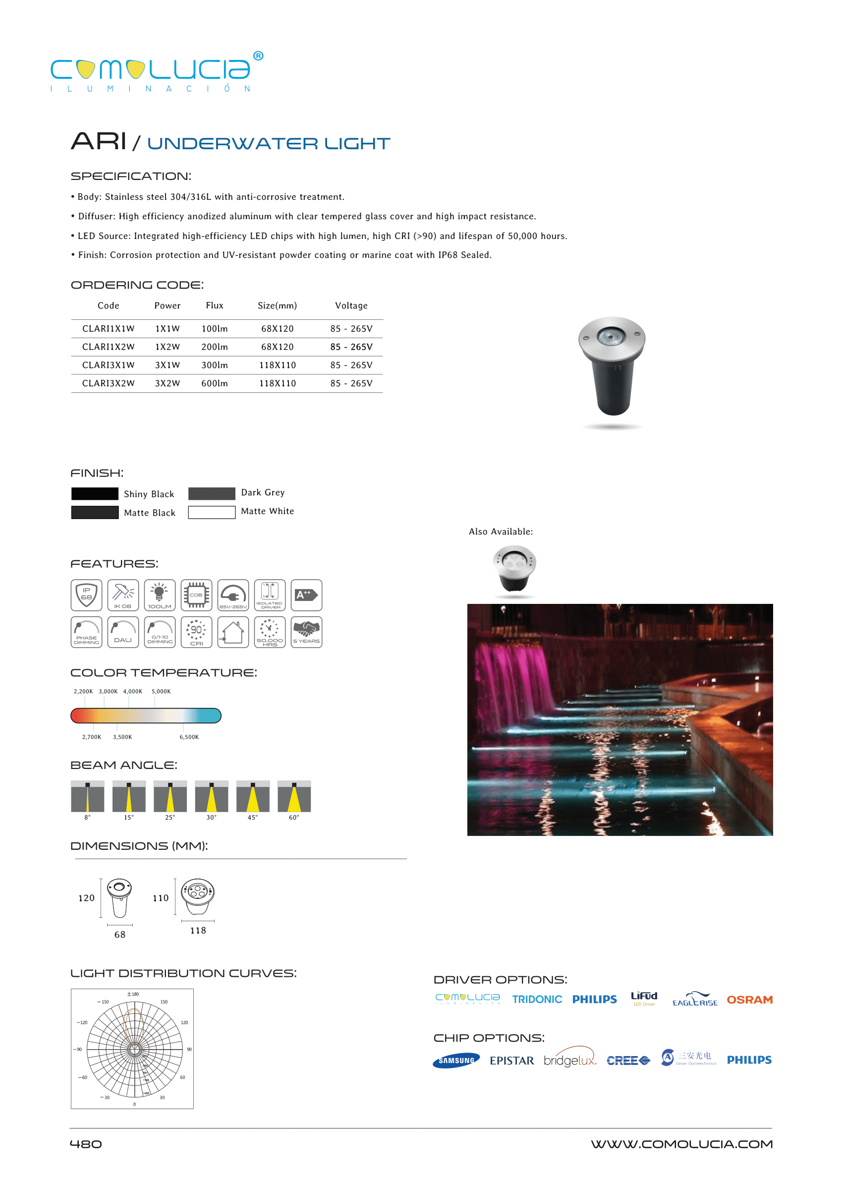 - Finish: Corrosion protection and UV-resistant powder coating or marine coat with IP68 Sealed.