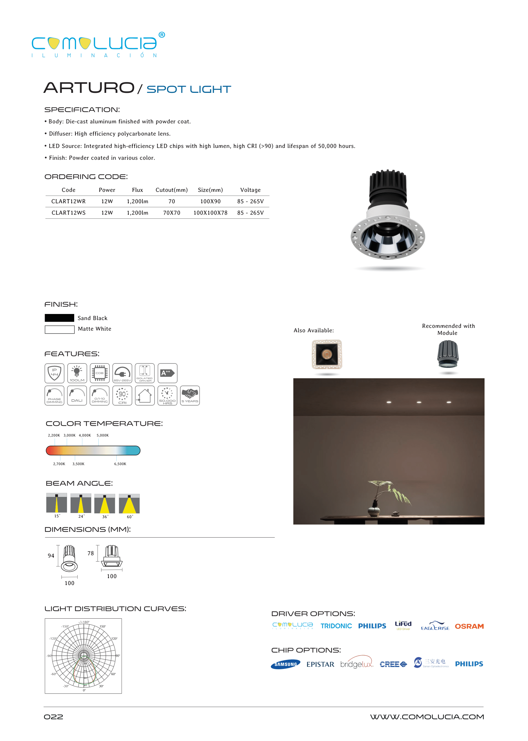 - LED Source: Integrated high-efficiency LED chips with high lumen, high CRI (>90) and lifespan of 50,000 hours.
