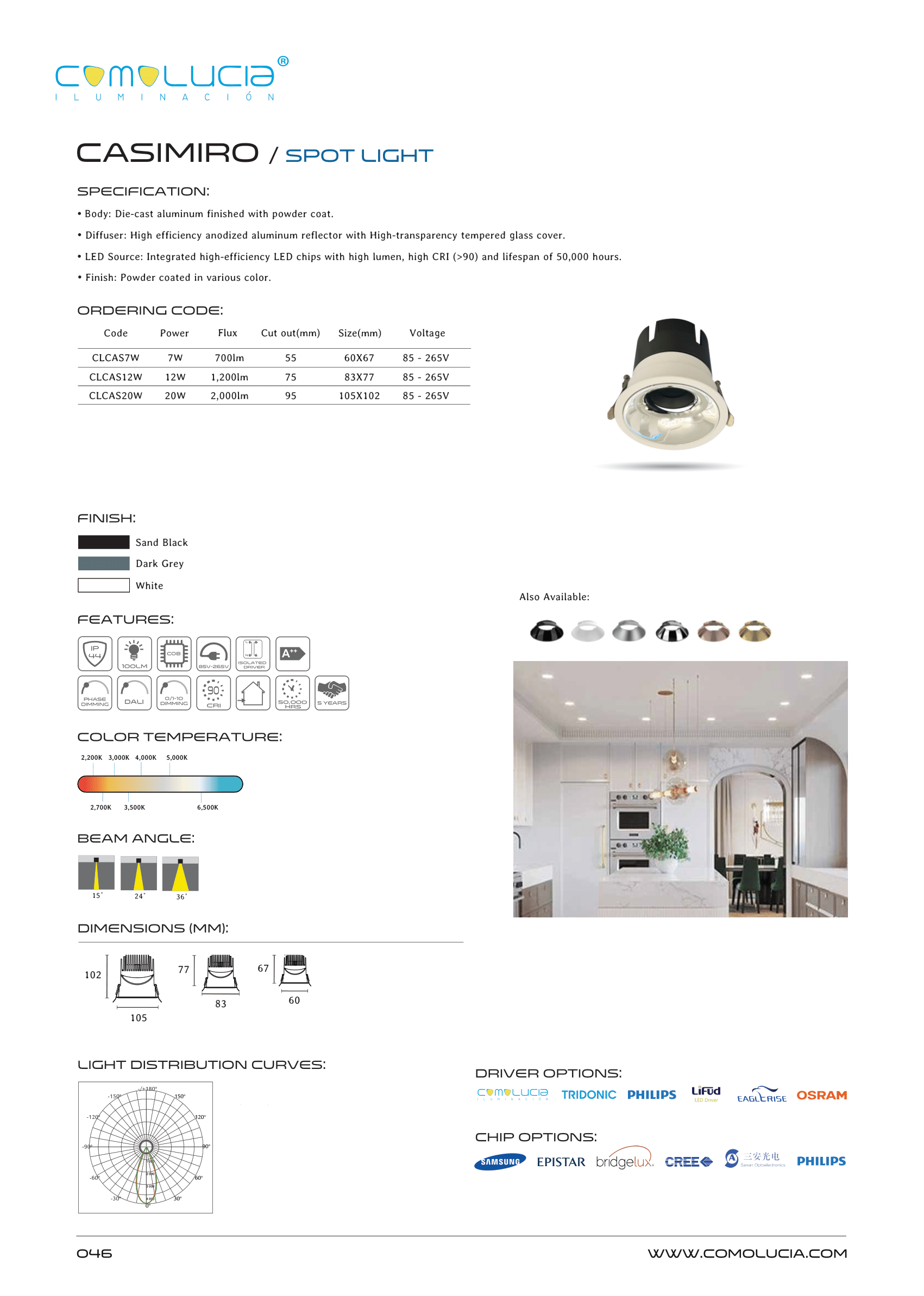 - LED Source: Integrated high-efficiency LED chips with high lumen, high CRI (>90) and lifespan of 50,000 hours. Finish: