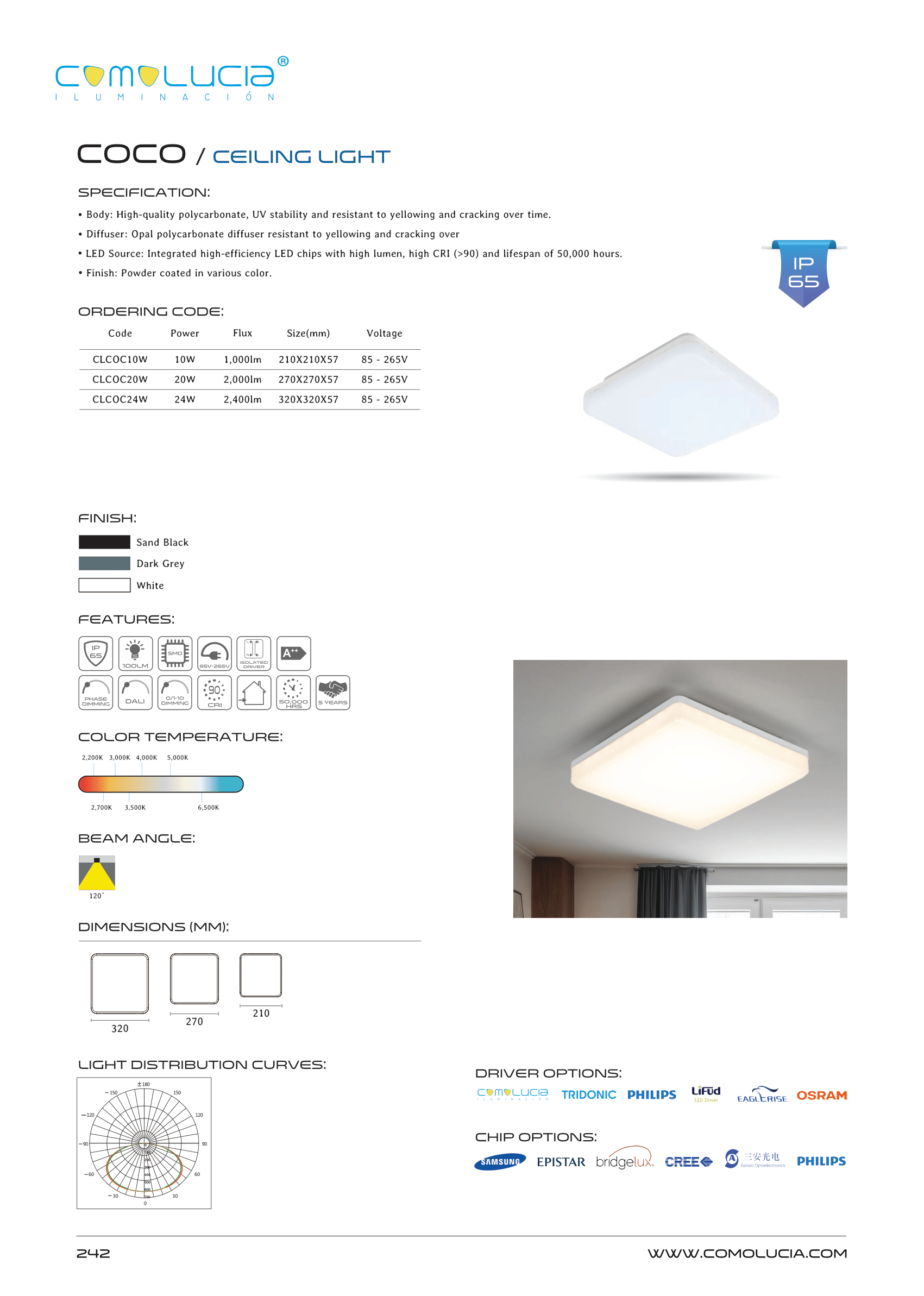 - LED Source: Integrated high-efficiency LED chips with high lumen, high CRI (>90) and lifespan of 50,000 hours.