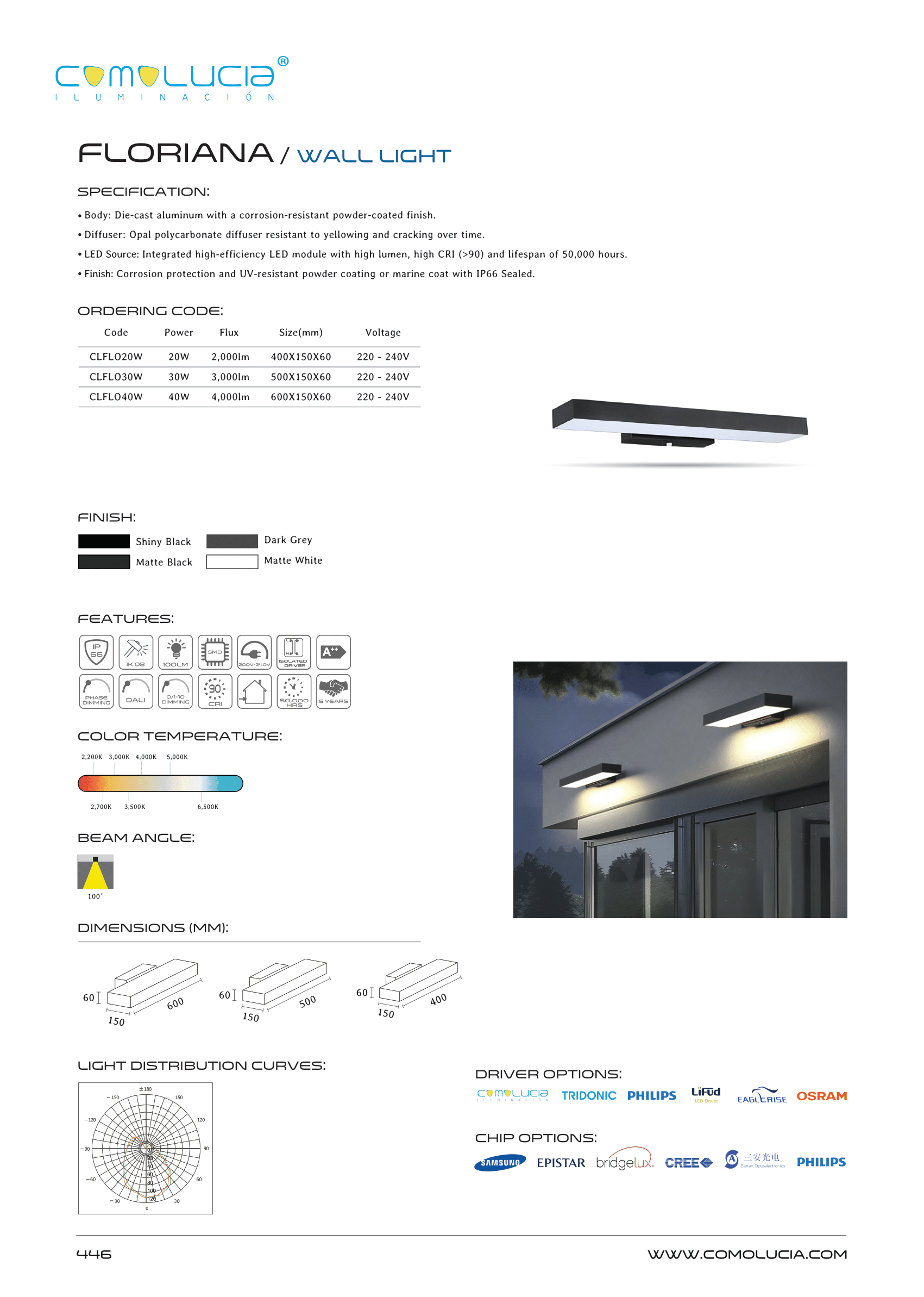 - LED Source: Integrated high-efficiency LED module with high lumen, high CRI (>90) and lifespan of 50,000 hours.