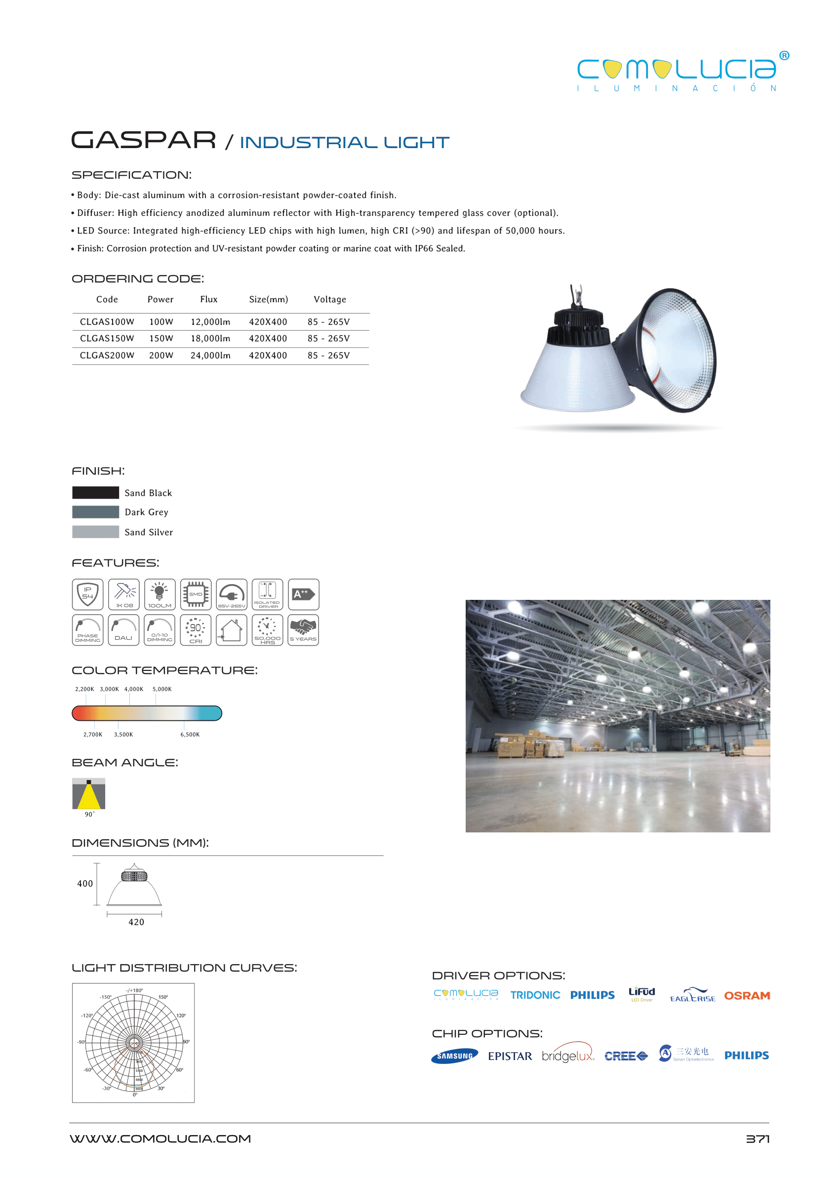 - Diffuser: High efficiency anodized aluminum reflector with High-transparency tempered glass cover (optional).
