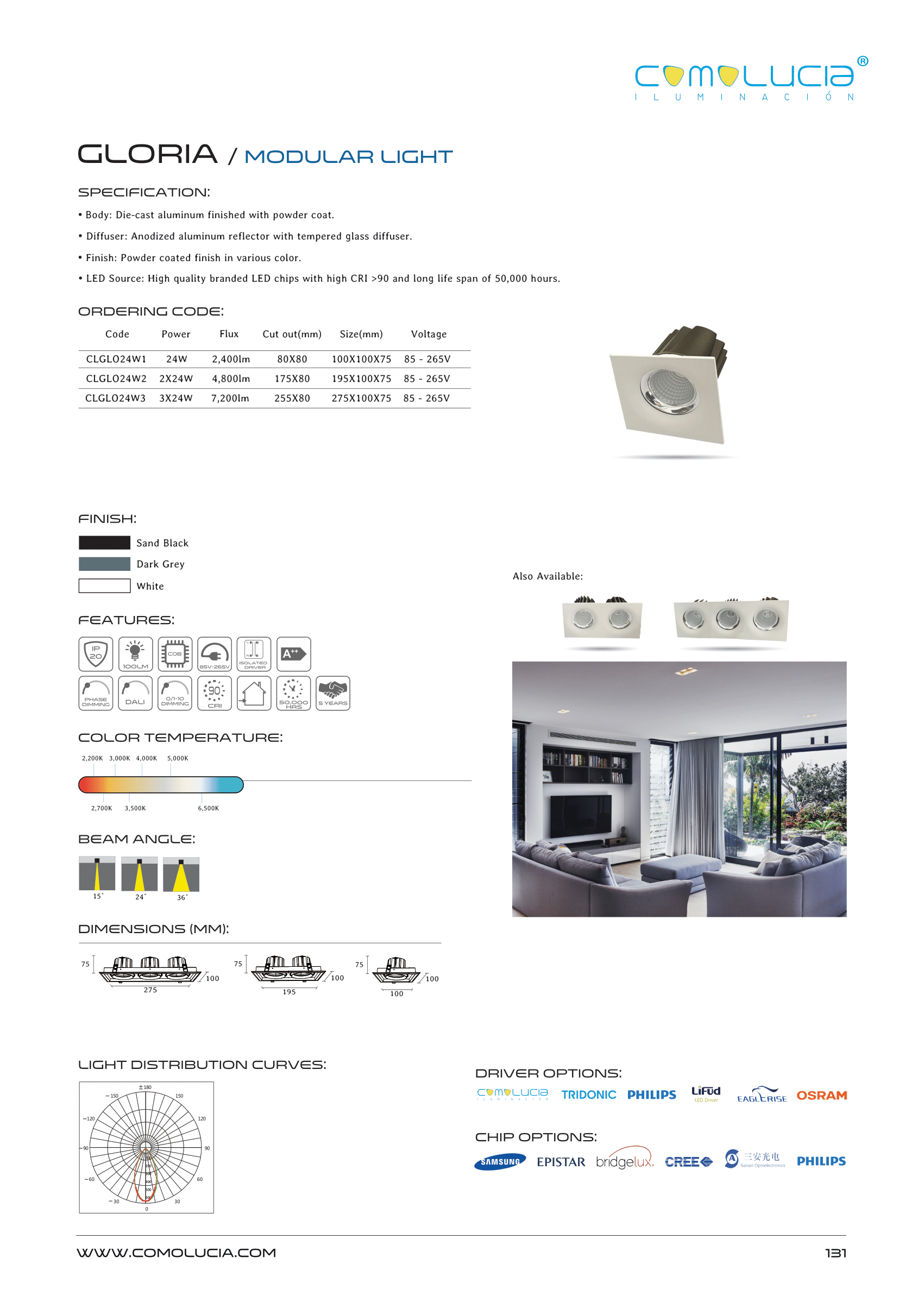 - LED Source: Integrated high-efficiency LED chips with high lumen, high CRI (>90) and lifespan of 50,000 hours.
