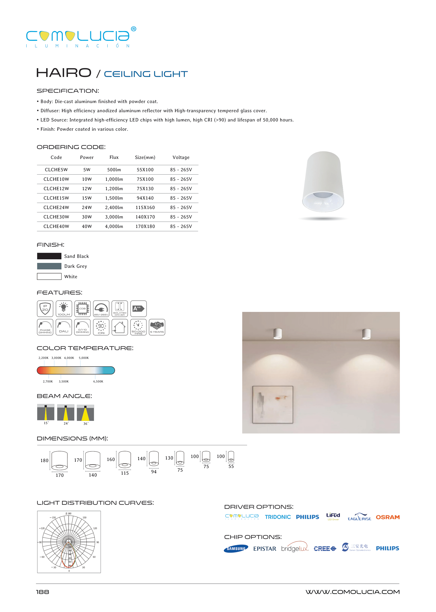 - LED Source: Integrated high-efficiency LED chips with high lumen, high CRI (>90) and lifespan of 50,000 hours.