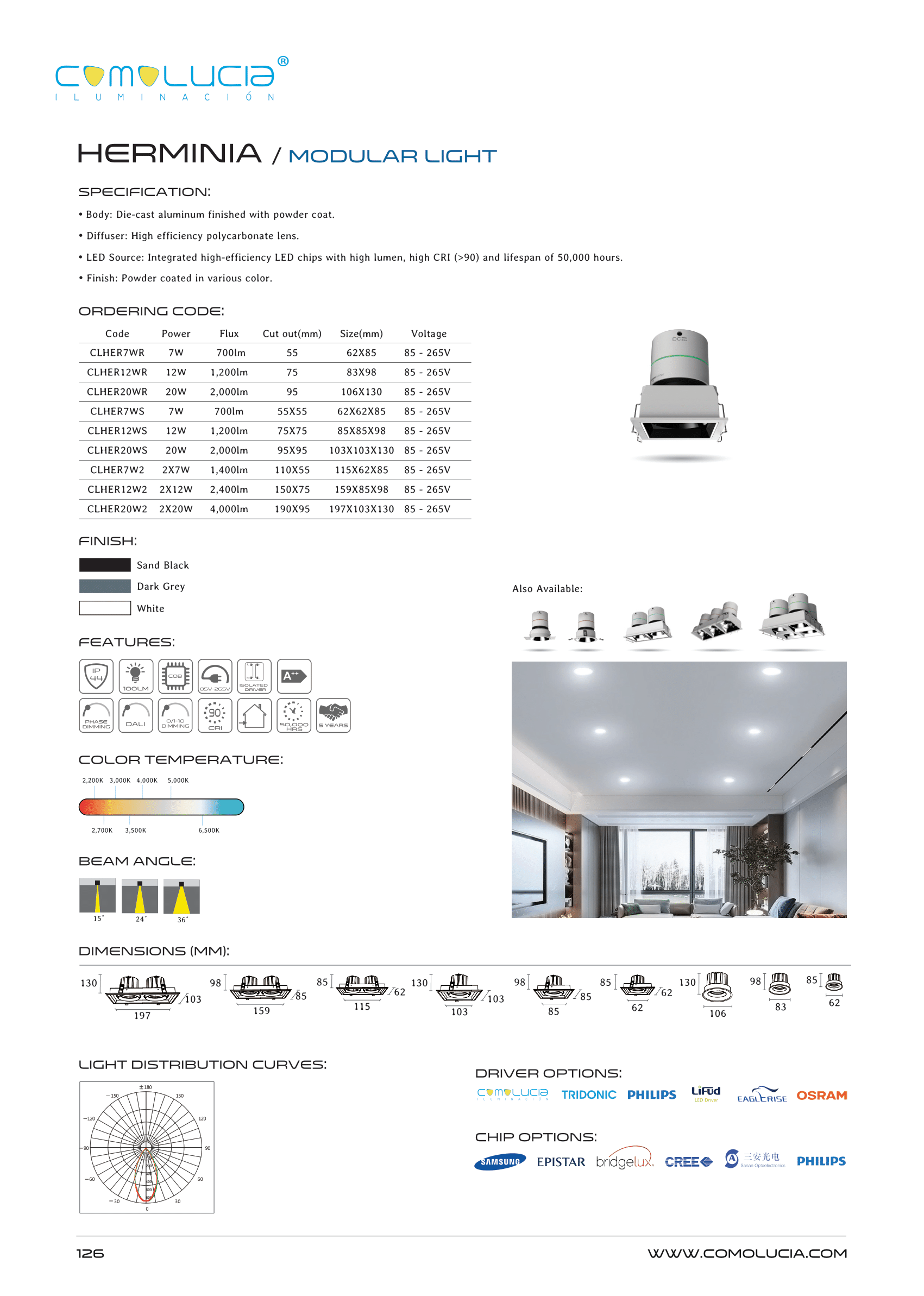 - LED Source: Integrated high-efficiency LED chips with high lumen, high CRI (>90) and lifespan of 50,000 hours.