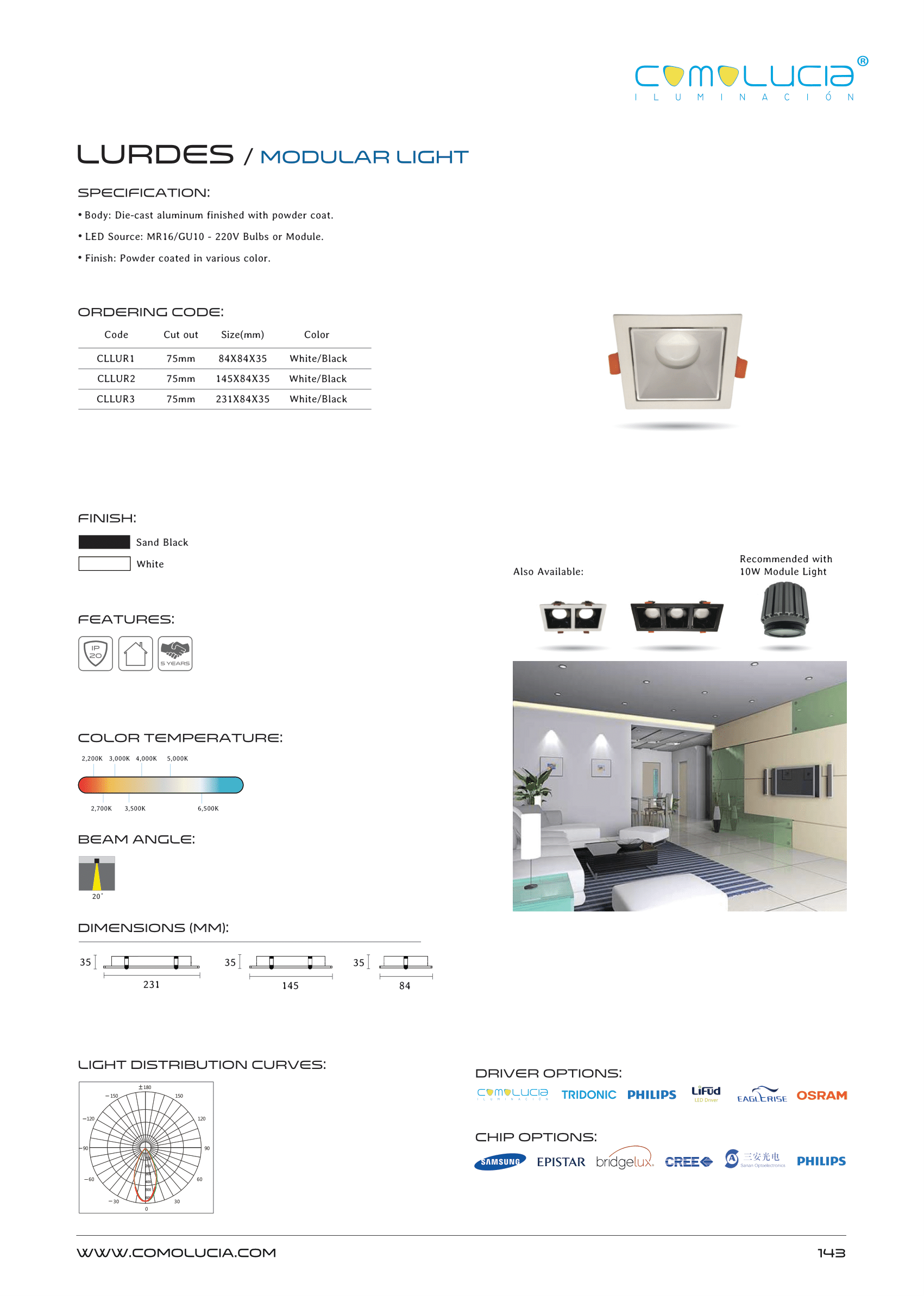 - LED Source: MR16/GU10 – 220V Bulbs or Module.