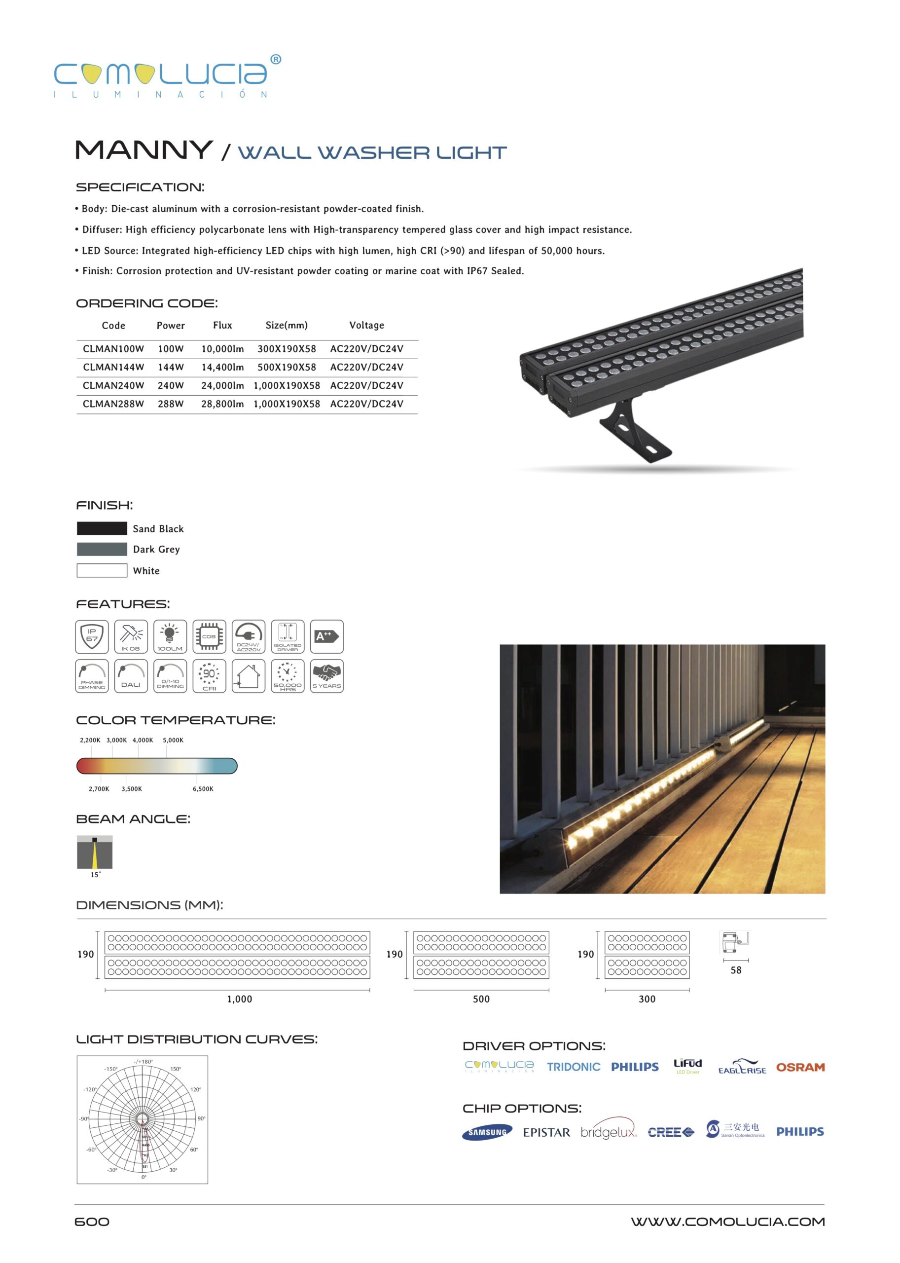 - LED Source: Integrated high-efficiency LED chips with high lumen, high CRI (>90) and lifespan of 50,000 hours.