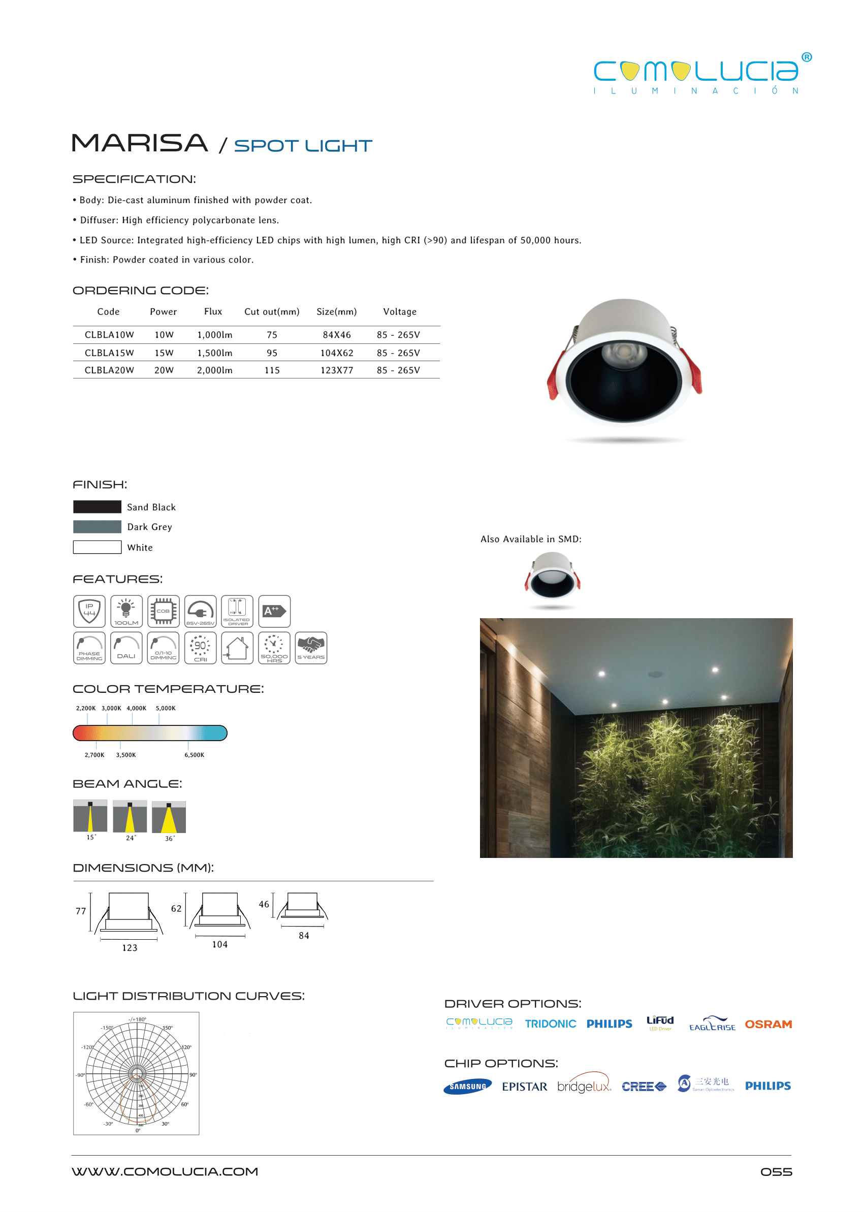 - LED Source: Integrated high-efficiency LED chips with high lumen, high CRI (>90) and lifespan of 50,000 hours.