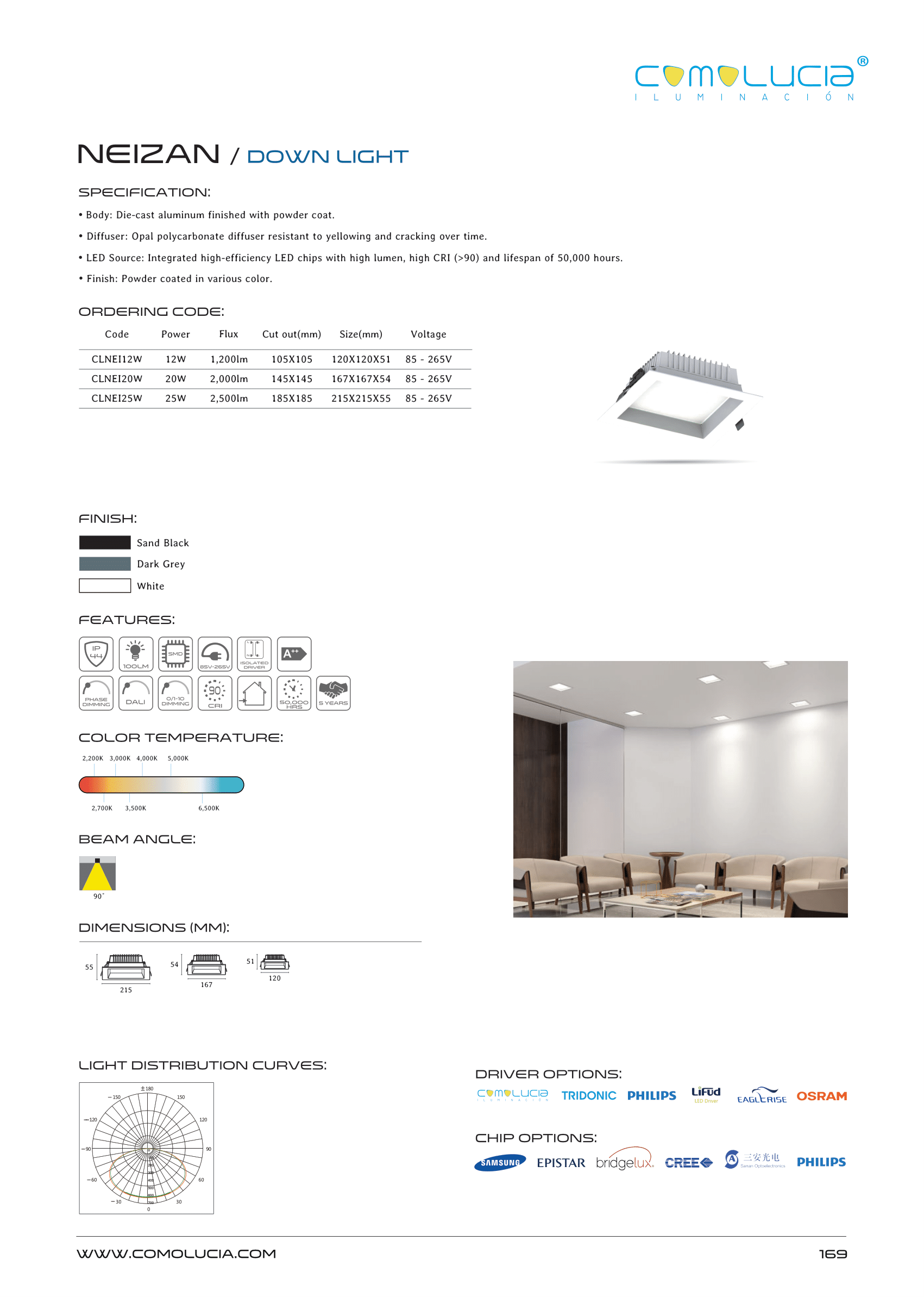 - LED Source: Integrated high-efficiency LED chips with high lumen, high CRI (>90) and lifespan of 50,000 hours.
