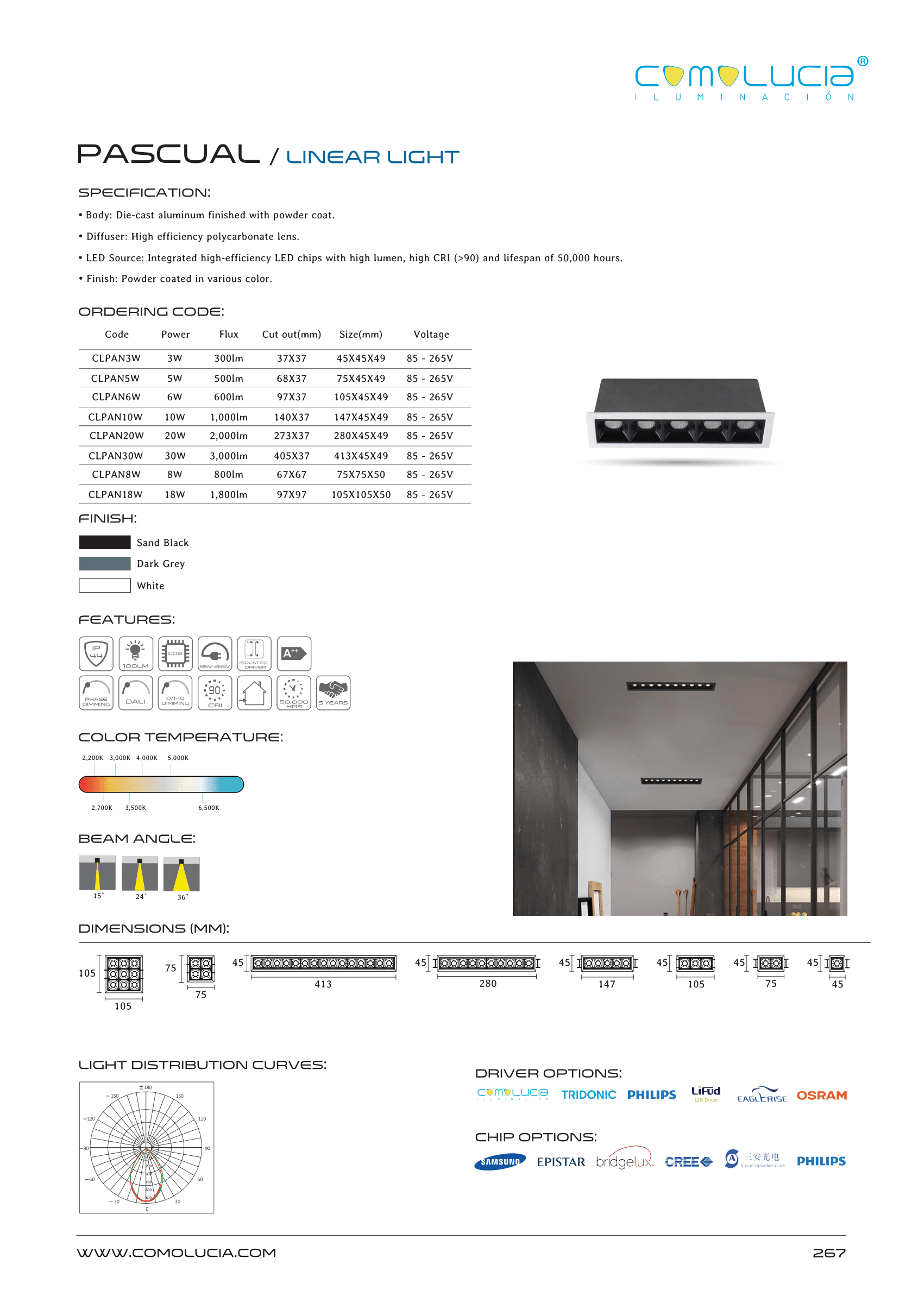 - LED Source: Integrated high-efficiency LED chips with high lumen, high CRI (>90) and lifespan of 50,000 hours.