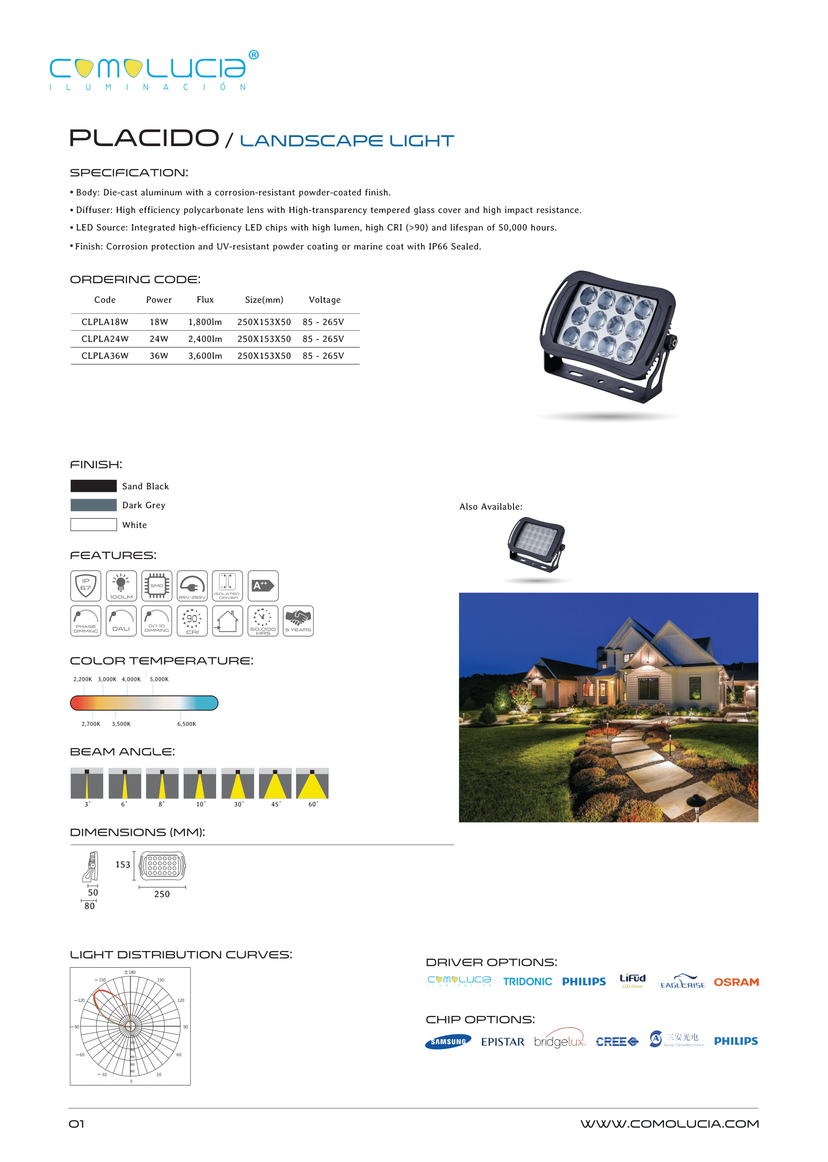 - LED Source: Integrated high-efficiency LED chips with high lumen, high CRI (>90) and lifespan of 50,000 hours.