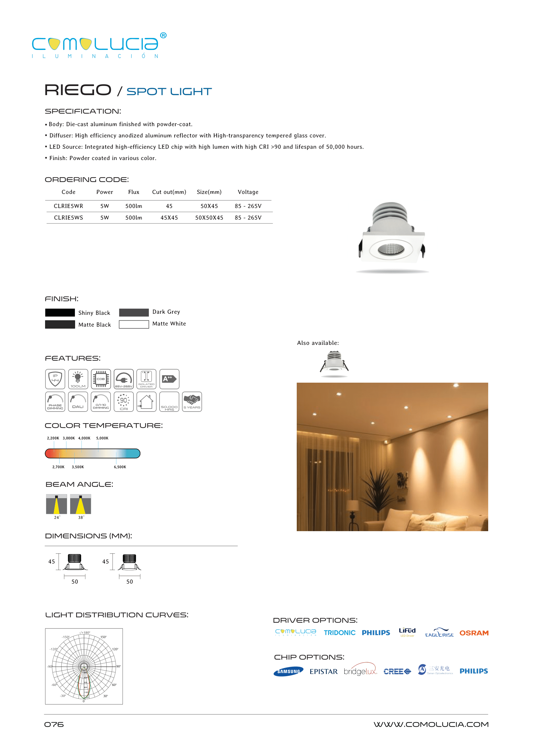 - LED Source: Integrated high-efficiency LED chip with high lumen with high CRI >90 and lifespan of 50,000 hours.