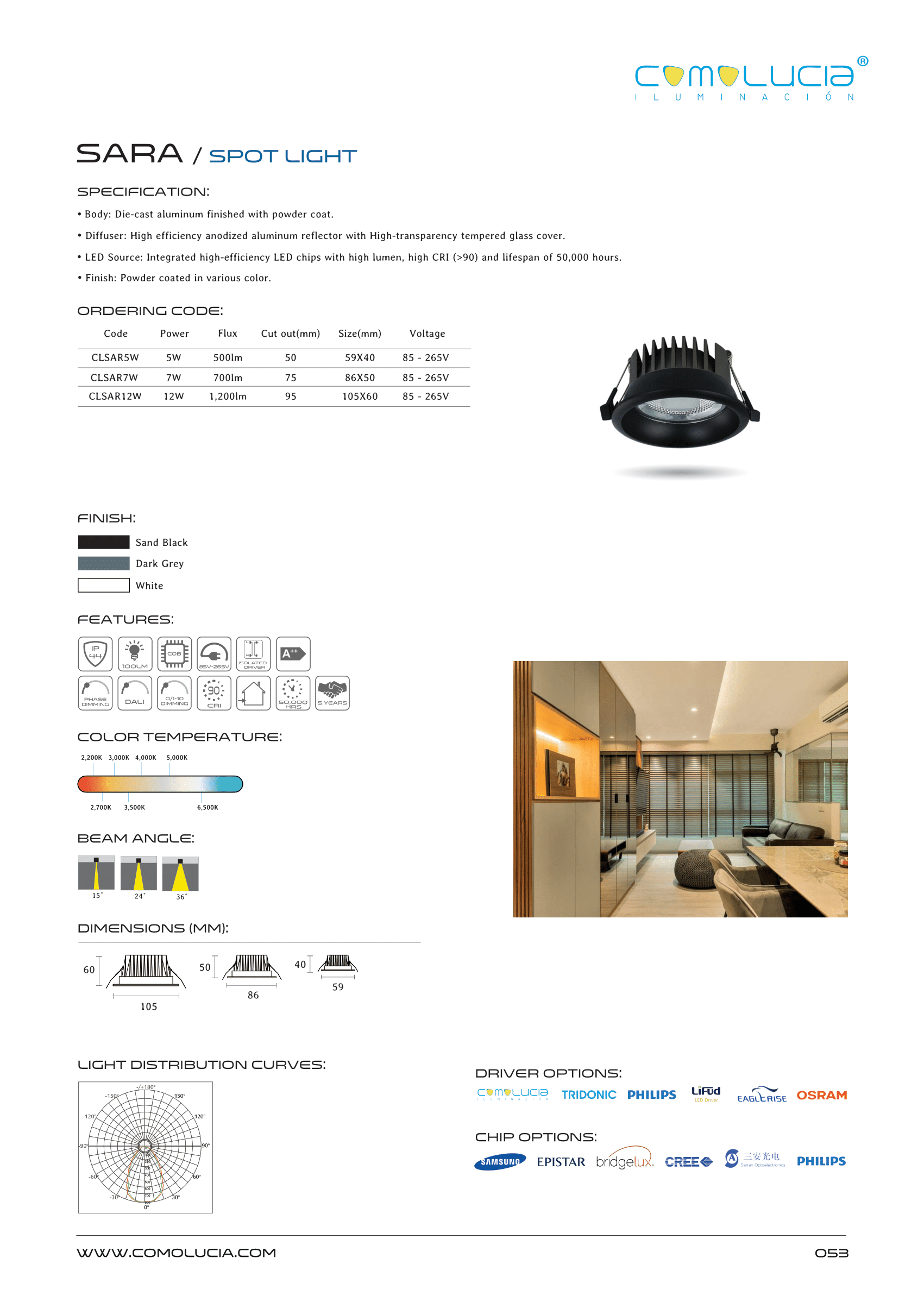 - LED Source: Integrated high-efficiency LED chips with high lumen, high CRI (>90) and lifespan of 50,000 hours.