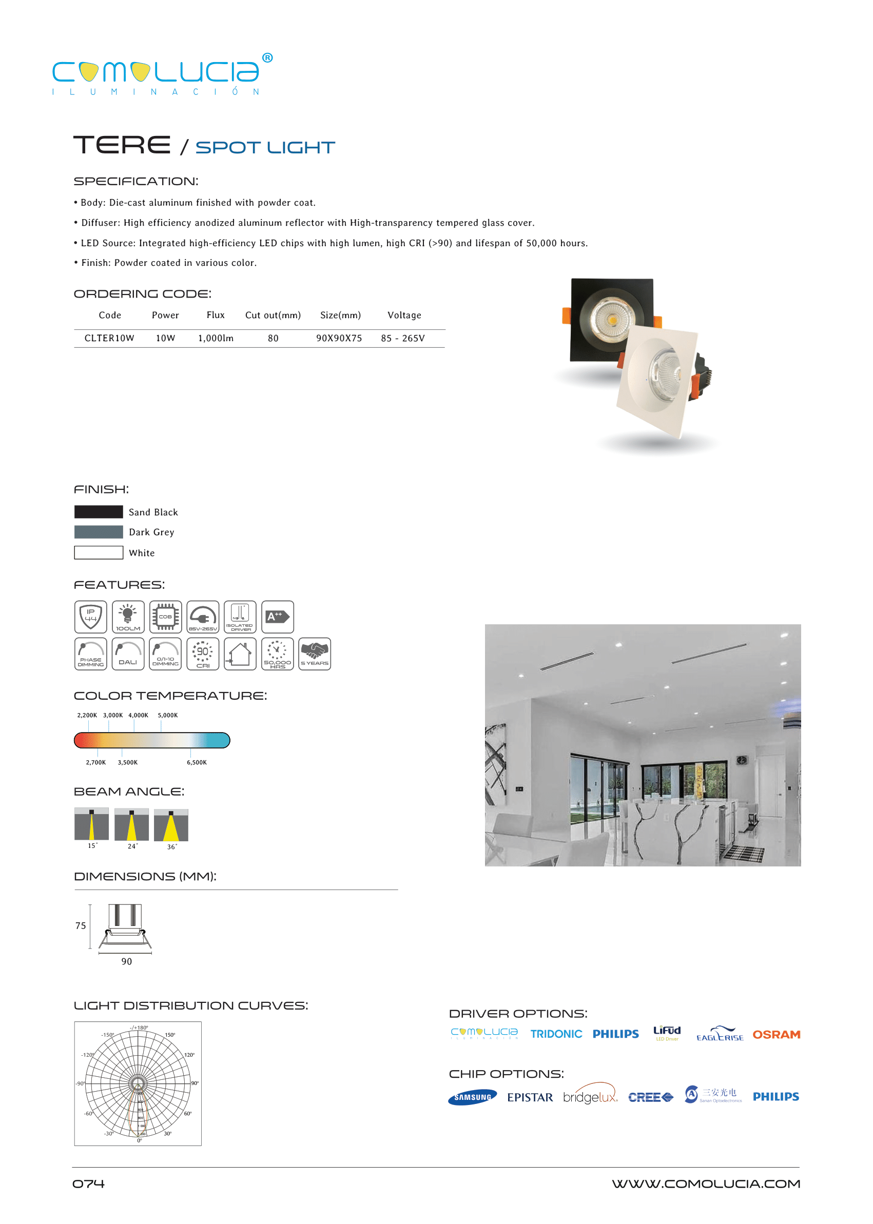- LED Source: Integrated high-efficiency LED chips with high lumen, high CRI (>90) and lifespan of 50,000 hours.