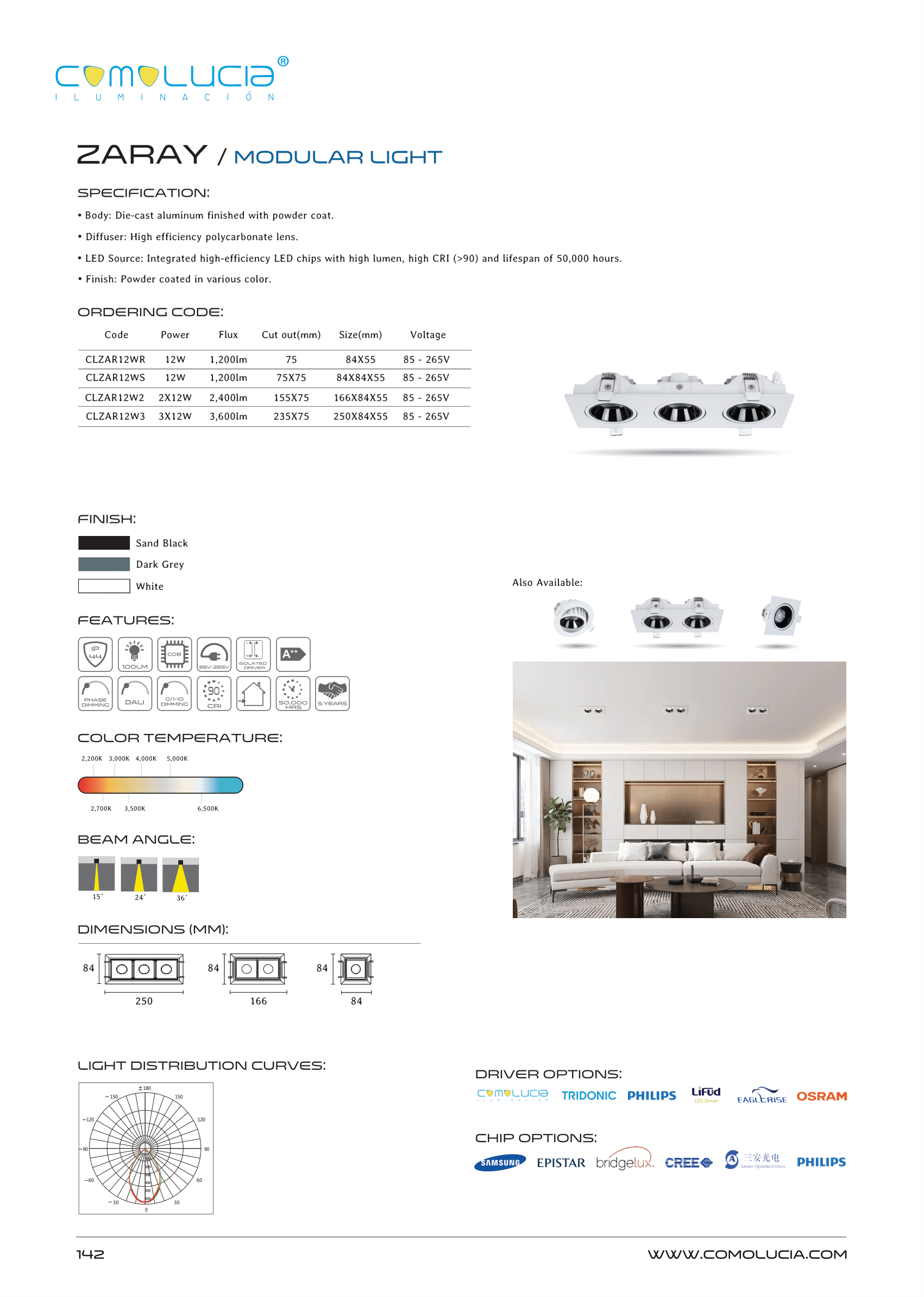 - LED Source: Integrated high-efficiency LED chips with high lumen, high CRI (>90) and lifespan of 50,000 hours.